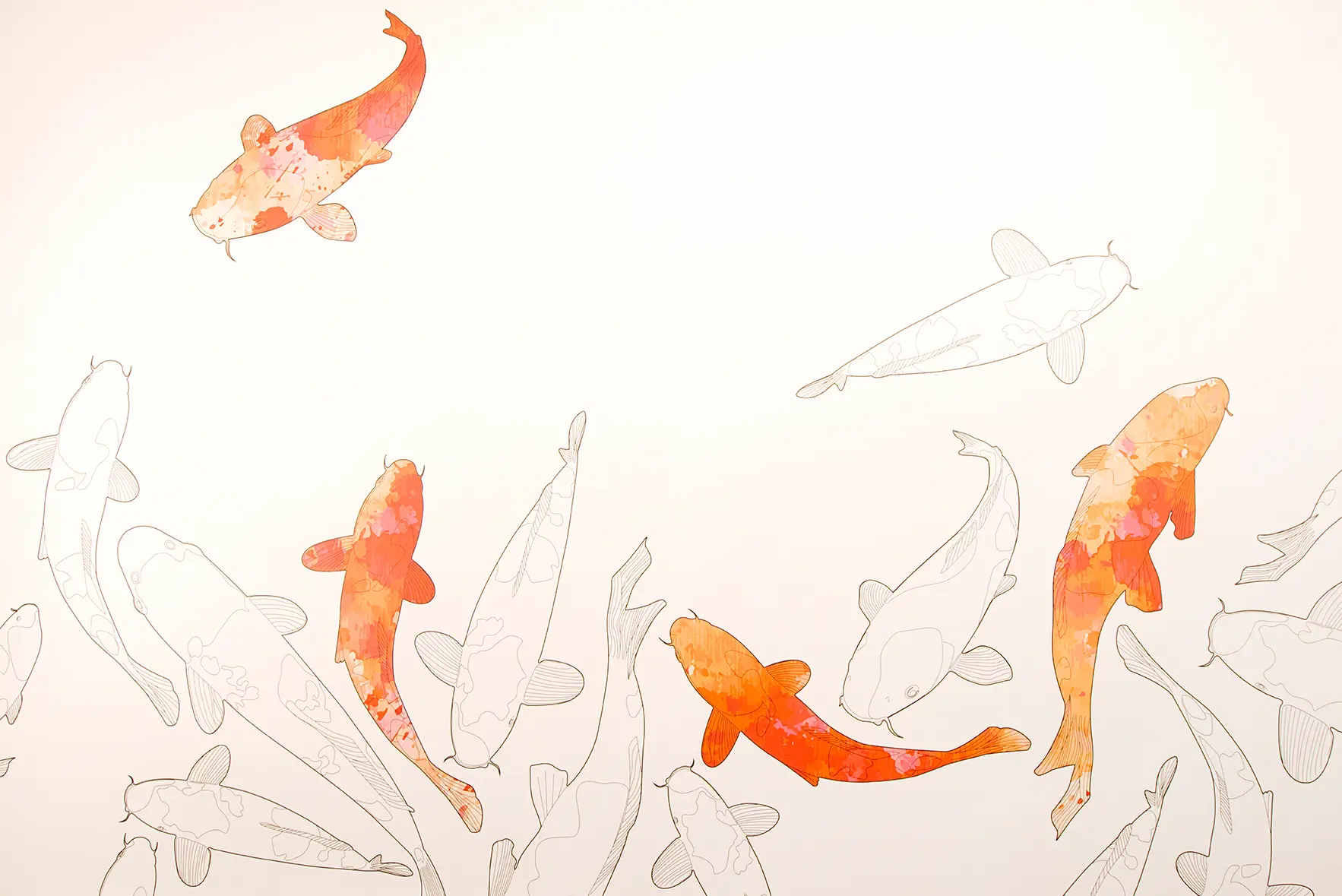 Our approach began with meticulous attention to detail, introducing new lighting that creates a warm and inviting atmosphere, complemented by fresh visuals that reflect the restaurant’s unique identity. One of the standout features of the redesign is our custom wallpaper, adorned with hand-drawn illustrations of koi carp by Hiroshi himself. These illustrations were scanned and digitally transformed to create an original design that blends traditional Japanese artistry with a contemporary touch.
